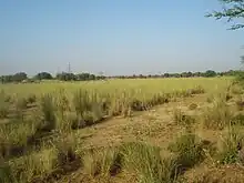 Grasses are important in Jhang District because they form pasturage for livestock.[4] The most common grass in the district is the chhimbar, which thrives in all types of soil.[4] It grows densely, and with good rainfall it can get very tall.[4] Lamb is a feathery grass that grows in kallar.[4] Lunak also grows in kallar; it is tall and high quality and requires a good deal of rain to thrive.[4] Garham somewhat resembles lunak in appearance, but is taller and stronger.[4] It does not grow in kallar soil, but instead usually grows under bushes that have been fertilised by dung.[4] It is not as good as lunak.[4] Kurya is an uncommon grass, but it is high quality and makes especially good grazing for horses.[4] Khar madhuna is a smaller grass, inferior in quality.[4] Its seeds are shaped like a woodlouse.[4]
