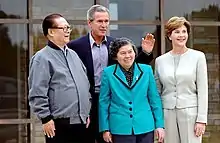 In the run-up to the 16th National Congress of the CCP, Hu Jintao had "almost unanimous support" to become the new CCP general secretary.[77] To maintain China's image as a stable and respected country, Jiang and Hu emphasized their unity, striving to make this transition the first "smooth and harmonious" one in the PRC's history.[78][79] Jiang stepped down as general secretary and left the Politburo Standing Committee, but retained the chairmanship of the Central Military Commission,[80] which controlled the army and the nation's foreign policy.[81] Jiang would continue counselling Hu from "behind the curtain", and it was formally agreed that Jiang would be "consulted on all matters of state importance".[81] Both men also reached a "tacit understanding" that Hu would not be considered a "core" leader like Jiang, Deng and Mao.[82]