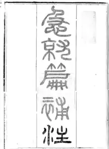 The title Jíjiùpiān uses the word piān , which is attested in Han dynasty texts with the meaning of "book, written document" (such as in the Hanshu 漢書 chapter on Wu Di, "著之於篇,朕親覽焉。"[1]). Several other Chinese dictionary titles use pian, for example, the (c. 500? BCE) Shizhoupian "Historian Zhou's Chapters" (c. 220 BCE) Cangjiepian "Cangjie's Chapters" (c. 543) Yupian "Jade Chapters", and (1066) Leipian "Categorized Chapters".