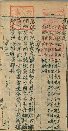In the Western Han dynasty (206 BCE-25 CE), the teaching of characters was emphasized, and scholars compiled other character primers and wordbooks besides the Jijiupian, for instance, the Fanjiangpian 凡將篇 The General Primer by Sima Xiangru (c. 179 – 117 BCE) and 32-7 BCE Yuanshangpian 元尚篇 The Yuanshang Primer by Li Zhang 李長, both of which are lost works.[14] These proto-dictionaries facilitated the development of Chinese xiǎoxué 小學 "minor learning; pre-modern 'linguistics'; philology" (which now means "primary school"), and laid the academic foundation for the compilation of wordbooks, vocabularies, and dictionaries.[15] The Han dynasty experienced the transition of Chinese lexicography from wordlists and glossaries to character dictionaries and word dictionaries. The Jijiupian generalized the practice of logically classifying characters into different sections, which inspired the "macro-level stylistic format of the Chinese dictionary".[5]
