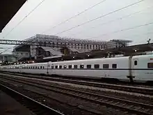 A high-speed train stopped at the ordinary train platform in 2014. The north station building behind was under construction.