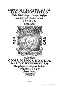 The Art of the Japanese Language (Portuguese: Arte da Lingoa de Iapam) was published at Nagasaki in three volumes from 1604 to 1608. In addition to vocabulary and grammar, it includes details on the country's dynasties, currency, measures, and other commercial information.[16] Although it was preceded by some manuscript glossaries and grammars, such as those given to the Philippine Jesuits who settled at Kyoto in 1593, it was apparently the first printed Japanese grammar.[3] A manuscript edition is in the Vatican Library; the two surviving copies of the printed version are in Oxford's Bodleian Library and the private collection of the Earl of Crawford.[24] It was translated into Japanese by Tadao Doi (土井忠生) in 1955.[16]
