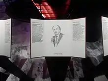 A drawing of Vale e Azevedo alongside a description of his presidency of Benfica on display at Museu Benfica