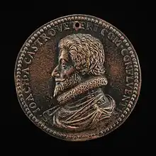 Joachim de Châteauvieux, baron de Verjon puis comte de Confolant (c.1545c.1615)[1] was a French governor, military officer, royal guard and favourite, during the French Wars of Religion and early Seventeenth-Century. Born into a noble family from Bresse with a history of royal service, Châteauvieux came to the attention of the royal family during the siege of La Rochelle in 1573, part of the fourth French War of Religion. The siege was led by the king's brother Anjou, and after Anjou was elected as king of the Commonwealth, Châteauvieux travelled with him to his new kingdom, serving as a member of his household during his brief reign there before he returned to France as Henri III. Back in France, Châteauvieux was again made a member of the king's household. In 1578, the king's long serving captain of the Scots Guard died, and Henri chose Châteauvieux for the prestigious post. In the following years he received both of the royal orders, that of Saint-Michel and Saint-Esprit.