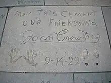 Joan Crawford's handprints and footprints were imprinted in a block in the forecourt of Grauman's Chinese Theatre in Hollywood on September 14, 1929.[101]