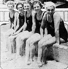 ![]() Swimmers from Boston during try-outs for the 1932 Summer Olympics, (left to right) Joan McSheehy, Susan Robertson, Louisa Lindstorm, Catherine Ames and Eleanor Holm[1] | |