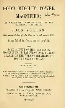 Vokins was born as Joan Bunce.[1] Her father Thomas Bunce was a yeoman of Charney Bassett in (what was then) Berkshire. She married another local farmer, Richard Vokins, of West Challow and she joined the Quakers. She was an enthusiastic evangelist for Quakerism. She persuaded her family and then set about to preach. In February 1680 she went to America, arriving in New York in May. She visited Long Island, Rhode Island, Boston, East and West Jersey, and Pennsylvania. On the return journey she went to the West Indian islands including Barbados, Antigua and Nevis,