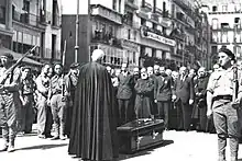 At unspecified time the CNT militiamen transported most prisoners from Ondarreta to the fortress of Guadalupe in nearby Hondarribia.[221] One source claims that in Guadalupe his captors offered Beunza freedom in exchange for money, the proposal he allegedly turned down.[222] On September 4, when Carlist troops were already fighting at the outskirts of Hondarribia, Beunza was called out for execution. According to eye-witness who survived the carnage, he tried to explain to militiamen that he was merely a lawyer, the declaration greeted with the derisive “tanto gusto en conocerte”. The rosary he always carried on him was taken away and he was allowed 15 minutes to write a message to his family. Then, when escorted through a tunnel running across the fortification, he was machine-gunned with a series of bullets;[223] his corpse was reportedly “impossible to look at”.[224] Two days later Nationalist troops seized Hondarribia. On September 8 Beunza's corpse was placed to lie in state in Palacio de la Diputación in Pamplona and then was buried during a solemn ceremony.[225] His killers have never been identified.[226]