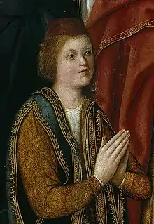 Isabella I was quite an attentive mother for such a busy queen.[10] John, being her only son and of delicate health, had a special place in her heart,[11][12] and she referred to him affectionately as 'my angel’ even when he was being reprimanded by her.[13] Isabella and Ferdinand attempted to ensure the sickly prince's well-being through prayer, charity, and careful oversight of his health.[14][15] John's wetnurses were Maria de Guzman, a member of the powerful Spanish House of Mendoza,[12] and Juana de Torres.[16] The latter stayed by the prince's side well into his adolescence, possibly as a result of his frail health.[17]