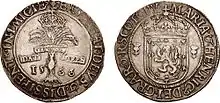 On 10 July 1567 Mary's opponents, the Confederate lords, ordered her servant Servais de Condé to surrender silverware in his keeping for coining to Acheson.[13][14] This included a silver gilt nef or ship for the queen's table.[15] In August 1567 Regent Moray ordered Acheson to coin a "James Ryall", depicting a crowned sword with the motto "Pro Me Si Merior in Me" and on the other side the royal arms with crowned letters "JR" for James VI, and the legend "Jacobus 6 Dei Gra Rex Scotorum."[16]