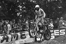 He then accepted an offer from designer Eric Cheney to campaign BSA B50 motorcycles in the 1973 FIM Motocross World Championship.[1][16] Despite the BSA's weight handicap, Banks still managed several top five placings in the world championships against lighter, two stroke motorcycles, including an impressive performance at the 1973 500cc United States Grand Prix in Southern California where, on the hard packed desert terrain, the explosive power delivery of two stroke engines put them at a disadvantage to more tractable power delivery of Banks' BSA.[1] He finished the first moto in third place behind Willy Bauer and Roger De Coster then, finished the second moto in fourth place behind Bauer, Gerrit Wolsink and Jaak van Velthoven.[17]