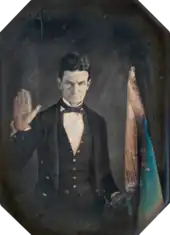 A daguerreotype of Brown taken by African-American photographer Augustus Washington in Springfield, Massachusetts, c.1846–1847. Brown is holding the hand-colored flag of Subterranean Pass Way, his militant counterpart to the Underground Railroad.[87]