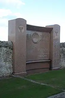 John Brunton died in 1937. He is buried in Inveresk cemetery with his wife, who died in 1899. His name is written on the reverse of the large red granite monument and is only visible from the northern cemetery. The monument includes a stone bench on its south side.