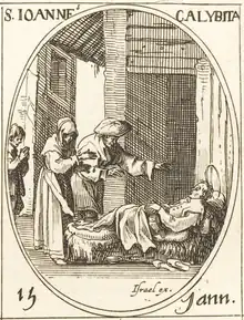 John Calybite[lower-alpha 1] (or John Calabites, Calibita, Chalybita, Kalabytes; died c.450) was a Greek monk and hermit. He left home at a young age and for several years was a monk in Jerusalem. He returned home disguised as a beggar, and his parents did not recognize him, but gave him a hut to live in. He revealed himself to his mother when on his deathbed. His feast day is 15 January.