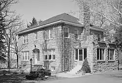 The property includes a detached three-stall garage at its southwest corner. Its design closely matches the house, with stone walls, a hip roof, and its own chimney.[2]