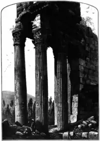 The sketches that formed the basis of Picturesque Palestine were compiled during Woodward and Fenn's two joint tours of Egypt and the Levant in the winters of 1877–78 and 1878–79. The two trips are documented in his correspondence with Woodward's wife and his mother. The pair received special permission to sketch inside and under the Mosque of Omar (the Dome of the Rock), although Woodward compared the streets of Jerusalem with the "dirtiest alleys of Baltimore". Oppressed by the heat, glare, and barrenness, the best he could say about the shore of the Dead Sea was "I suppose it is not so bad it couldn't be worse". Nazareth was "the worst",[2] while he was most impressed by the Syrio-Roman ruins at Baalbek.[27] In 1879, he returned to New York and spent much of the next three years readying the illustrations for print.[3] The works were hugely successful, with Woodward and Fenn earning $10 000 a year each in royalties on the Holy Land volumes.[2]