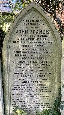 For many years Francis resided at 2 Catherine Street, and then at 20 Wellington Street in the Strand, by his publishing offices. In 1849 he joined the new Bloomsbury Chapel under the pastorate of William Brock. Later on he lived at 11 Burghley Road, Highgate Road; but he returned in 1881 to 20 Wellington Street, he there died on 6 April 1882, and he was buried in Highgate cemetery on 18 April, near the grave of Michael Faraday, in the presence of many literary men. In his memory two John Francis pensions were founded in connection with the Newsvendors' Benevolent Institution.[1]