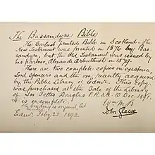 Glasse's inscription on the endpaper of a copy of Thomas Bassendyne's Bible, with his signature, sold by his family in 2017[20]