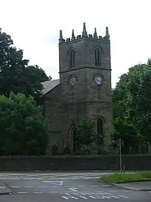 In 1821, Hodgson visited London, and made an expedition to Oxford for the purposes of his researches. He was also busy in raising money for a new church at Heworth, which he designed himself.[1] It replaced an older chapel,[3] was built for Hodgson by John Stokoe,[4] and was consecrated in May 1822.[1] Conservation work in the graveyard gave Hodgson the topic for a paper, a biography of Richard Dawes.[5] A find of a coin hoard, with coins of Ecgfrith of Northumbria, however, turned out to consist of recent fakes when they were analysed in the 1980s, following doubts raised in 1956.[6][7]