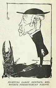 At Ormond College, Rentoul had a great influence over many generations of candidates for the Presbyterian ministry, and was a conspicuous figure in all the counsels of his church. He showed great ability in conducting religious controversies, for which he was equipped with wide reading and knowledge of the languages of the original texts. He stated once that he never entered on a fight willingly, but once the contest had started he fought with great vigor and, many of his friends thought, with a full appreciation of the joy of combat. It was not for nothing that he was popularly known as "Fighting Larry"; but he had no ill-will to his opponents and never bore rancor. He was made moderator-general of the Presbyterian Church of Australia for 1912–14, and when World War I broke out was appointed chaplain-general of the Australian Imperial Force.