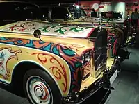 John Lennon's psychedelic Rolls-Royce is an art car created in 1967 and later displayed in many museums. After previously owning a used Rolls-Royce, John Lennon of the Beatles ordered a new bespoke Rolls-Royce Phantom V limousine in December 1964. Originally painted matte black, the car was delivered six months later in June 1965. Lennon appeared in the film How I Won the War, filmed largely in Spain, in 1966. The car was damaged there, including scuffing of its finish. Lennon decided to have the car repainted bright yellow and decorated with motifs from Romany decorative arts. Artist Steve Weaver embellished the car with elaborate, bright swirls and floral motifs in the psychedelic style associated with the Beatles in that era, and the vehicle became a sensation. Lennon and his wife Yoko Ono donated it to the Cooper-Hewitt Museum for a tax deduction in 1977, and it has been widely exhibited ever since. When sold in 1985, it was the most expensive automobile ever to be auctioned at that time. The limousine is now owned by the Royal British Columbia Museum in Victoria, British Columbia.