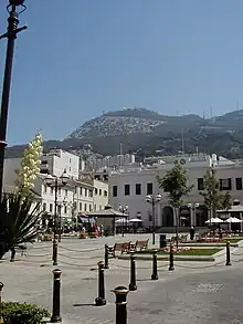 During the first century of the British period, the square was used for military parades by the garrison and therefore known as the Parade[1] or Grand Parade.[3][4] In 1704, after the city's capture by an Anglo-Dutch fleet, the British converted the hospital and chapel of La Santa Misericordia into a debtors' prison. In 1753, a survey of Gibraltar went on showing a prison at the western end of the square.[3] After the Great Siege, a colonnaded Georgian guardhouse was built on the southern side of the square.[1] It was the Main Guard, the place from which all the sentries in Gibraltar were posted each evening.[5] Some years later it hosted the Fire Brigade.[1] After the move of the brigade to the new fire station at Victoria Battery in 1938, it became the Rates Office.[1] Today the guardhouse houses the Gibraltar Heritage Trust.[1]