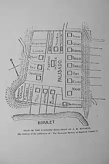 The main battle of the Pequot War started in the predawn hours of May 26, 1637, when Colonial forces led by Captains John Mason and lieutenant Robert Seeley, along with their Indian allies, attacked one of two main fortified Pequot villages at Mystic. Only 20 soldiers breached the palisade's gate and were quickly overwhelmed, to the point that they utilized fire to create chaos and facilitate their escape from within. Sergeant William Hayden of Windsor is credited with saving the life of Captain Mason inside the fort, using his sword to cut through the bow-string of one of the Pequot warriors aiming his weapon at Mason.[6] The ensuing conflagration trapped the majority of the Pequots and caused their death; those who managed to exit were slain by the sword or musket from the others who surrounded the fort. Only a handful of approximately 500 men, women, and children survived what became known as the Battle of Mistick Fort.