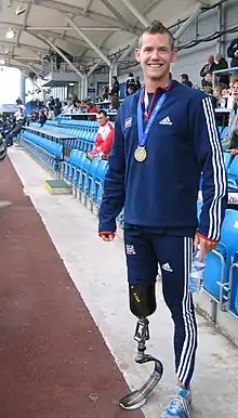 In 2000, when he was 19 years old, his right leg was amputated above the knee following a serious motorcycle accident. He took up running again after being fitted with a prosthesis, and participated in his first race in 2004. The following year, he was selected to represent Great Britain at the International Paralympic Committee (IPC) European Championships, and took the bronze medal in the 200 metres (sport class T42).