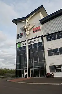McKenna's stainless steel sculpture of a 'Hovering Kestrel' measures six metres across its wingspan by four metres high, sited on a building facade 14 metres high. The Kestrel was commissioned by the client for the Citadel Logistics Building on the Black Country Spine route, near Bilston in the West Midlands. The Kestrel concept for the artwork came about through design research work undertaken by A4A associate Steve Field drawing on Natural History information on the former site.