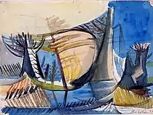 John Melville, Landscape (1937), watercolour and conte chalk on paper