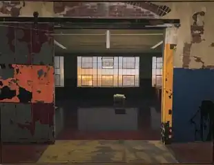 In a subsequent series of works that combined his interior and industrial motifs, Moore turned to the Globe Dye Works—a restored Civil War-era factory in the Frankford section of Philadelphia where his longtime studio was located.[41][42] John Yau described one of these paintings, Distant Voices (2014–15), as a "vertigo-inducing" mix of Magritte and trompe-l'œil; its composition of skylights, windows and sky utilized multiple views and reflective surfaces to upend perceptions of up or down and perspective.[53][1] Moore's depictions of the building's cavernous interiors, such as Fire Door (2014) and Departure (2021), recalled works by Vermeer and abstract expressionist color-field artists with large, rectangular panels of vivid and dark color set off by various patterns and distant city views.[41][6] Other works, such as Frankford Station (2012), have been noted for their sections of glass block windows that "liquefied light, making for small, luminous abstractions or transformed descriptions of what is beyond them."[16][1]