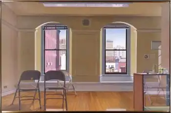 In the late 1970s, Moore began extending his still lifes out to rooms that frequently included window views onto urban scenes. He continued to focus on color, light, shape (often variations on squares) and mood, while developing new interests in relationships between the observed and formal, perceived versus depicted size, and inside versus outside.[35][36] In the early, frontal composition Thursday (1980), for example, he portrayed a mysteriously still, sparsely furnished loft in hushed light, centered by two symmetrical windows overlooking a city panorama.[43][27]
