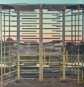 Brooklyn Rail critic Robert Berlind wrote that Moore's later "workmanlike" paintings transformed industrial remains "into paradigms of a formal, Apollonian order" organized by foreground portals and architectural grids of glass brick and window mullions that acted "as foils to diverse optical surprises and momentarily disorienting pleasures."[16] In Turnstile (2012), Moore relocated a rusted gate from a Coatesville mill to the front of the Bangor Waterworks Building, creating an interplay of decrepit and pristine, near and far, light and dark, entrance and barrier.[1][16]