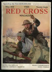 After he moved to the east coast, he began to have success branching out into other areas of illustration. The work that he is remembered for today is a painting he did for the Red Cross during World War I in May 1918. It featured the picture of a medic caring for a wounded soldier, signaling for help. He did a second cover for the Red Cross in August 1918, a soldier carrying a wounded military service dog. His other works were of marine themes, of military ships at sea, struggling with the elements and fighting. Though he moved into magazines, he continued to make a living from news illustrations, including the Bridgeport Standard in the Connecticut town where he lived,[6][7] and the New York Tribune.