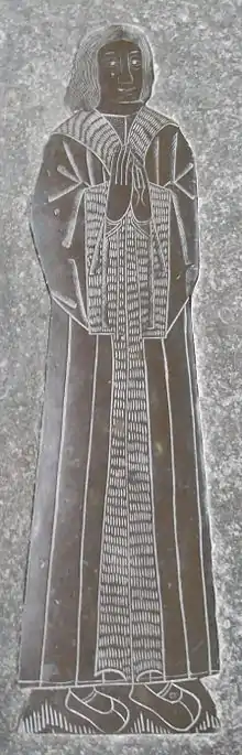 The Gloucestershire historian Ralph Bigland (d.1784) identified him with the surviving ledger stone set into the floor of the South aisle of St Laurence's Church, Lechlade,[29] in which he had founded the chantry of St Blaise. The north and south chapels in that church are likely to have been paid for by the Duchess of York and John Twynyho to house the chantries founded in 1472.[30] However more recently it has been suggested as the brass of Robert Hitchman (d. circa 1510).[31] Of the many brasses the ledger stone displayed originally, including effigies of his wife, children, heraldic escutcheons, marginal inscription, two scrolls, and four plates, on which were most probably the evangelistical symbols, and his merchant's mark (a tau cross combined with a Latin cross)[32] only that of a figure representing John Twynyho survives. Only the matrices of the other brasses indicate their positions and shapes. His brass measures 3 ft. 2in. by 9in. He wears long hair but his face is clean shaven. His tunic reaches to his ankles and is faced with fur, a customary garment among the civilians at the end of the 15th century and commencement of the 16th century. The large open sleeves hide the girdle which most probably he wore. The under-garment is seen at the neck, and again at the wrists, where its sleeves appear to be tightly buttoned. The feet are encased in the large square-toed shoes of the period. The figure is erect and slightly turned to his left with his hands uplifted in a prayerful attitude. The brass is illustrated in Ralph Bigland's Gloucestershire, Vol II, p. 144.