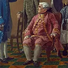 In 1765, he was a larger seated figure included in a caricature[5] painting by Thomas Patch.[4][6] Patch was another Englishman living abroad and he had left Rome for Florence after he had been banished for a scandal based on his homosexuality.[7]
