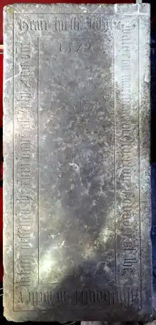 Ledger stone of John Waldron in St Peter's Church, Tiverton, inscribed: "Heare lyeth John Waldron Marchant of Tiverton founder of the almshouses in West x which deccessed the xviii daye of July An(n)o D(omi)ni 1579"