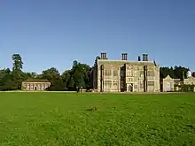 In 1599 he succeeded to the Felbrigg estate in Norfolk, including Felbrigg Hall, from his father's first cousin Thomas Wyndham (d. 1599), who like his two brothers Sir Roger and Francis (d. 1592), Judge of Common Pleas (whose monument exists in St Peter Mancroft in Norwich) died without issue. Felbrigg was the seat of the senior line of the Wyndham family. In gratitude he placed a monumental brass inlaid in Purbeck marble, in Felbrigg Church.[15] Sir Edmund Wyndham (d. 1568) was the eldest son of Sir Thomas Wyndham (eldest son of Sir John Wyndham (beheaded 1503 on Tower Hill with James Tyrrell) by his first wife Lady Margaret Howard, 4th daughter of John Howard, 1st Duke of Norfolk (d. 1485)) by his first wife Alianore Scrope, daughter and heiress of Richard Scrope of Upsall, Yorks. Sir John also placed a monumental brass inlaid in Purbeck marble in Felbrigg Church to Thomas Wyndham's sister Jane Wyndham (d. 1608). Both brasses are in the same style, but much smaller, as those Sir John erected in Watchet church to his parents and in Ilminstaer Church to his uncle Nicholas Wadham. The original accounts concerning the shipping and laying down of the Felbrigg brasses survive in the Wyndham papers at Felbrigg Hall, and although the brasses are known to have been purchased in London, the maker's name is not recorded.[16] Sir John gave Felbrigg to his third son Thomas Wyndham (d. 1653), for whom he rebuilt the manor house, completed in 1624,[17] which survives today. The arms of father (impaling Portman) and son (impaling Lytton) survive sculpted in stone side by side above the front door.[18]