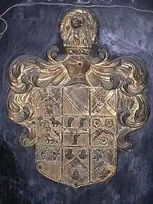 - Thomas Wyndham (d. 1653), 3rd son, to whom his father gave Felbrigg Hall and jointly with him rebuilt the ancient manor house, completed in 1624.[20] The arms of father (impaling Portman) and son (Wyndham with cadency mark of a crescent for difference of a second son, impaling Lytton Ermine, on a chief indented azure three ducal crowns or) survive sculpted in stone side by side above the front door.[21] He married Elizabeth Lytton.