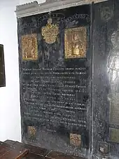 Sir John Wyndham was one of the heirs to the large fortune of his uncle Nicholas Wadham and helped to put into effect his plans for the founding of Wadham College. Sir John Wyndham also erected similar brasses, but much smaller, in St Margaret's Church, Felbrigg, Norfolk, to his cousin Thomas Windham (d. 1599) (in the nave), from whom he inherited Felbrigg Hall, and to Thomas's sister Jane Coningsby (d. 1608) (in the chancel). The inscriptions in accomplished verse on all these monuments are believed to have been written by Wyndham himself.[1]