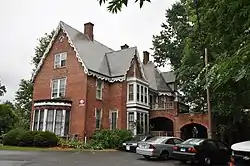 The Hooker House is located in Hartford's Asylum Hill neighborhood, near the southern end of a block bounded by Forest, Hawthorn, and South Marshall Streets. It is set back from each of these roads, and its location is obscured by apartment buildings that have been built on its former estate grounds. It is a large 2+1⁄2-story brick building trimmed in brownstone, with a roughly L-shaped plan. It has a gabled roof encrusted with a variety of projecting dormers and gable sections. All of these are adorned with carved vergeboard, which effectively encircles the building. Windows in these projections are Gothic lancet-style pointed arch windows.[2]