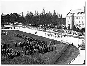 Johnston Hall at the University of Guelph was named after William Johnston (1848–1885) who was the founder and first principal of the Ontario Agricultural College from 1874 to 1879. Johnston Hall was built in 1931 as a student residence and home of administrative offices.[1] Johnston Hall is the second building that opened in 1932 as the first building, the Italianate-style Moreton Lodge, was demolished in 1928 - this is represented by the portico which resides on Johnston Green. The Portico was the front entrance to the F.W. Stone Farmhouse which was part of old Johnston Hall.[2] During the Second World War, both Johnston Hall and Johnston Green served as headquarters for the Royal Canadian Air Force. Today, Johnston Hall is a symbol and landmark of the agricultural college and the University of Guelph.[3]