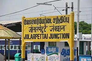 Jolarpettai Junction railway station [1] (station code: JTJ) is located in the Tirupattur district of Tamil Nadu, India. Jolarpettai Junction railway falls within Chennai Central- Bangalore City Line via Bangarapet Junction, Krishnarajapuram and Jolarpettai–Shoranur line leading to Kerala trunk via Salem Jn, Erode Jn, Coimbatore Jn, Palakkad Jn and hence connect Chennai to Mangalore through ShoranurJn, Kozhikode and Kannur. Chennai to Thiruvananthapuram through Thrissur, Ernakulam Jn and Kollam Jn .[2]