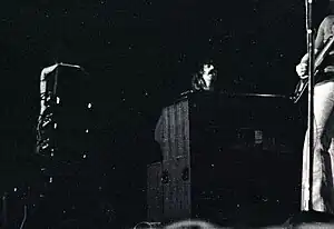 Lord absorbed the blues sounds that played a key part in his rock career, principally the raw sounds of the great American jazz and blues organists, such as Wild Bill Davis, Jimmy Smith, Jimmy McGriff and "Brother" Jack McDuff ("Rock Candy"), as well as the stage showmanship of Jerry Lee Lewis and performers like Buddy Holly, whom he saw perform at the De Montfort Hall in Leicester in March 1958.[5] The jazz-blues organ style of black R&B organ players in the 1950s and 1960s, using the trademark blues-organ sound of the Hammond organ (B3 and C3 models) and combining it with the Leslie speaker system (the well-known Hammond-Leslie speaker combination), were seminal influences on Lord. Lord also stated that he was heavily influenced by the organ-based progressive rock played by Vanilla Fudge after seeing that band perform in Great Britain in 1967, and earlier by the personal direction he received from British organ pioneer Graham Bond.[6]