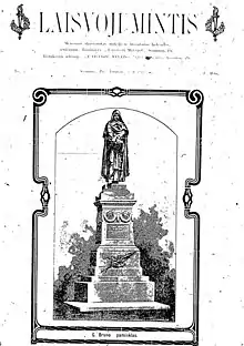 On 22 December 1889, Šliūpas established the Lithuanian Scientific Society (Lietuvių mokslo draugystė) in Baltimore and became its chairman. The primary goal of the society was to publish Lithuanian texts and otherwise promote education among Lithuanians.[76] Its first publication was Šliūpas' work on Lithuanian-language texts from the 16th century to present published in 1890 in Tilsit, East Prussia.[a 2] It contained mostly patriotic and nationalistic excerpts from older texts with essays by Šliūpas on the current situation of and future hopes for the Lithuanian National Revival, and thus were more a like a chrestomathy than a proper history of Lithuanian literature.[78] In 1891, together with Burba, Šliūpas published Bestiality of the Russian Czardom toward Lithuania, the second English-language publication by the Lithuanian immigrant community.[79] Šliūpas also delivered speeches and lectures on various topics from Darwinism and religion to socialism. In winter 1889–1890, he delivered about 30 such speeches.[80] One of the lectures on Lithuania's past, present, and future was developed and published as a separate brochure in 1897.[81] In March 1892, the Scientific Society began publishing monthly magazine Apšvieta (Enlightenment). It was the first Lithuanian magazine devoted solely to culture and education. In total, 15 issues were published in Tilsit, East Prussia. Edited by Šliūpas, the magazine could not avoid his anti-religious and pro-socialist views.[82]