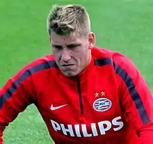 On 9 July 2015, de Wijs was named part of the senior squad that would fly to PSV's pre-season camp in Evians-les-Bains taking part in the Valais Cup.[8] On 15 September 2015, de Wijs was an unused substitute in a 2–1 Champions League group win over Manchester United.[9] On 21 October 2015, he made his senior debut in a Champions League game coming on as a substitute for Simon Poulsen in the 74th minute against Wolfsburg where they lost 2–0. Ten days later, de Wijs made his Eredivisie debut against De Graafschap replacing Héctor Moreno where they won 6–3.[4][10] On 21 November 2015, de Wijs with teammate Jeroen Zoet signed new deals keeping them at the club until 2019.[11] After impressing at Jong PSV, de Wijs was called up for the first-team by manager Phillip Cocu on 3 December 2015.[12]