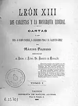 Relatively unknown beyond the Traditionalist Levantine circles, in 1894–95 Corbató was elevated to nationwide celebrity.[34] It was because of his 1894 booklet León XIII, los carlistas y la monarquía liberal.[35] Resembling an earlier pamphlet of Félix Sardà y Salvany, it was a most intransigent interpretation of papal teachings and contained onslaught on liberal and conservative politics; the booklet presented Carlism as the sole depositary of Catholicism[36] and lambasted various breeds of traitors.[37] León triggered legal action as Corbató alleged that the regent, Maria Christina, was heading the Spanish freemasonry.[38] The cause turned into a scandal and was attentively followed by national press; even the prime minister Sagasta admitted to having read the pamphlet.[39] Corbató was expulsed from the Dominican order, the first such case ever recorded in Spain.[40] In 1896 he was sentenced to 11 years in prison and huge financial penalty.[41]