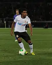 In 2009, playing for Bragantino, he drew the attention of São Paulo giants Corinthians, and was signed by the club. His first league goal for the club came on 30 May 2010, coming off the bench to score Corinthians's fourth goal, sealing a 4–2 win over state rivals Santos.[6] He would eventually go on to win important competitions with the São Paulo side, such as the 2011 Brasileirão and the 2012 Copa Libertadores, cementing himself as a hero for his club.[7] Along the way to the Copa Libertadores final, Paulinho netted the only goal of the two-legged quarter-final tie against fellow Brazilian side Vasco da Gama, scoring in the 87th minute of the second leg on 23 May 2012 to send Corinthians into the semi-finals.[8]