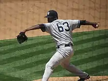 At the close of spring training in 2014, the Yankees decided to transition Ramírez from a starting pitcher to a relief pitcher as a result of injuries suffered earlier in his career.[7] The Yankees promoted Ramírez to the major leagues on May 18 as the 26th man on their roster for a doubleheader, but he did not pitch and was optioned back to Scranton/Wilkes-Barre after the games.[8] The Yankees promoted Ramírez again on June 4.[9] He debuted against the Oakland Athletics that day by pitching two innings, yielding two hits and one run.[10][11] After being sent down, he was called up again on June 13.[12] In 2014, he was 0–2 with a 5.40 ERA for the Yankees, and in 2015 he was 0–0 with a 15.00 ERA.[13]