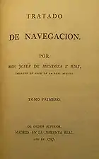 Josef (also José or Joseph) de Mendoza y Ríos (1761–1816) was a Spanish astronomer and mathematician of the 18th century, famous for his work on navigation. The first work of Mendoza y Ríos was published in 1787: his treatise[1] about the science and technique of navigation in two tomes. He also published several tables for facilitating the calculations of nautical astronomy and useful in navigation to calculate the latitude of a ship at sea from two altitudes of the sun, and the longitude from the distances of the moon from a celestial body.